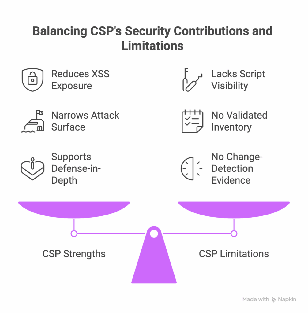 CSP narrows where scripts may load, but it doesn’t observe what approved code does once it executes. It cannot record data access, network calls, or behavioral changes, and it doesn’t generate the validated inventory or alert evidence auditors expect under PCI DSS 4.0.1.