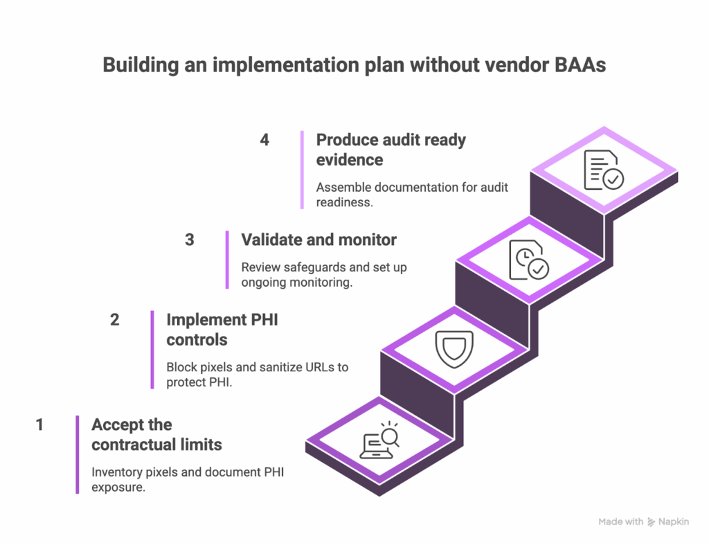 - Days 46 to 60: Produce audit ready evidence. Assemble the documentation that demonstrates your controls in action. Include your pixel inventory, PHI control measures, monitoring history, and your record of BAA requests that vendors declined. Prepare the narrative that explains how your technical safeguards achieve compliance even without vendor BAAs.