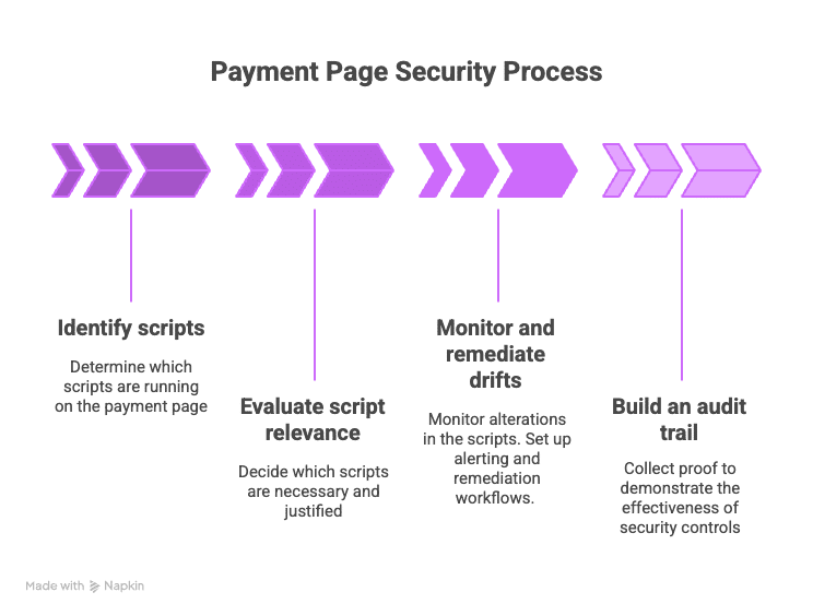First, you get clear on what scripts actually run on your payment page. Then you decide which ones belong there and why. After that, you watch for change so you can catch drift as it happens. And finally, you pull the evidence together so you can show the controls are real.