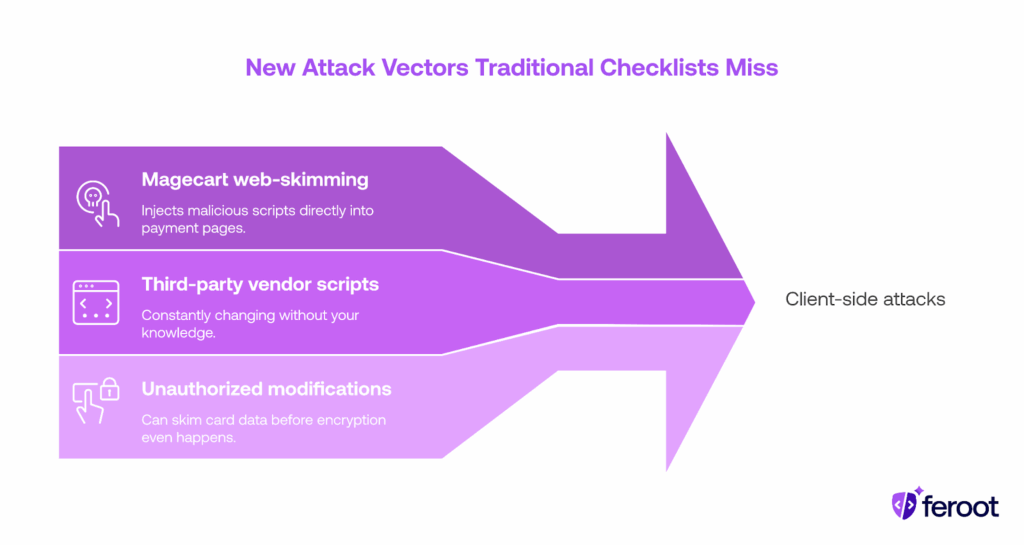 The attack vectors tell the story. Magecart campaigns inject malicious scripts directly into payment pages. Third-party vendor scripts change without notification. Unauthorized modifications skim card data before encryption happens. These attacks live in the browser, where traditional perimeter defenses and manual checklists don’t look.