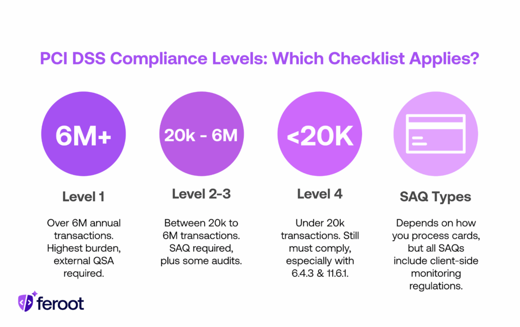 PCI compliance levels from 1 to 4 are based on annual transaction volume. Level 1 merchants process over 6 million transactions and face the highest burden, requiring external Qualified Security Assessor audits. Level 2 and 3 merchants process between 20,000 and 6 million transactions, requiring Self-Assessment Questionnaires (SAQs) plus some audits. Level 4 merchants process under 20,000 transactions but still must comply, especially with Requirements 6.4.3 and 11.6.1. Your SAQ type depends on how you process cards and handle cardholder data, but all e-commerce SAQs now include client-side monitoring expectations.