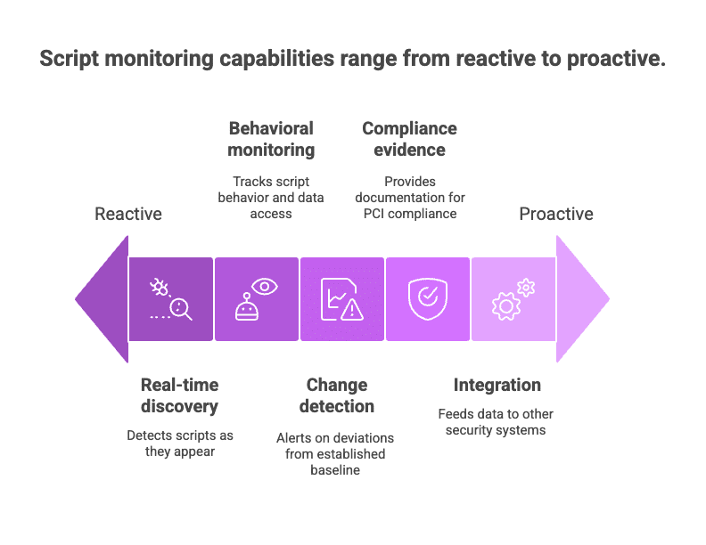 The second capability is behavioral monitoring. It is not enough to know that a script exists; PCI DSS 6.4.3 is explicit that you must understand and justify what it does on payment pages. That means tracking data access, network activity, DOM manipulation, and storage patterns in the browser.