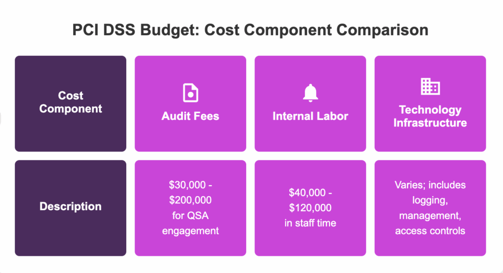 | Level 1 (6M+ transactions) | $245,000–$600,000 | $160,000–$350,000 | QSA RoC ($80K–$200K), internal labor ($40K–$100K), technology improvements ($65K–$200K) |